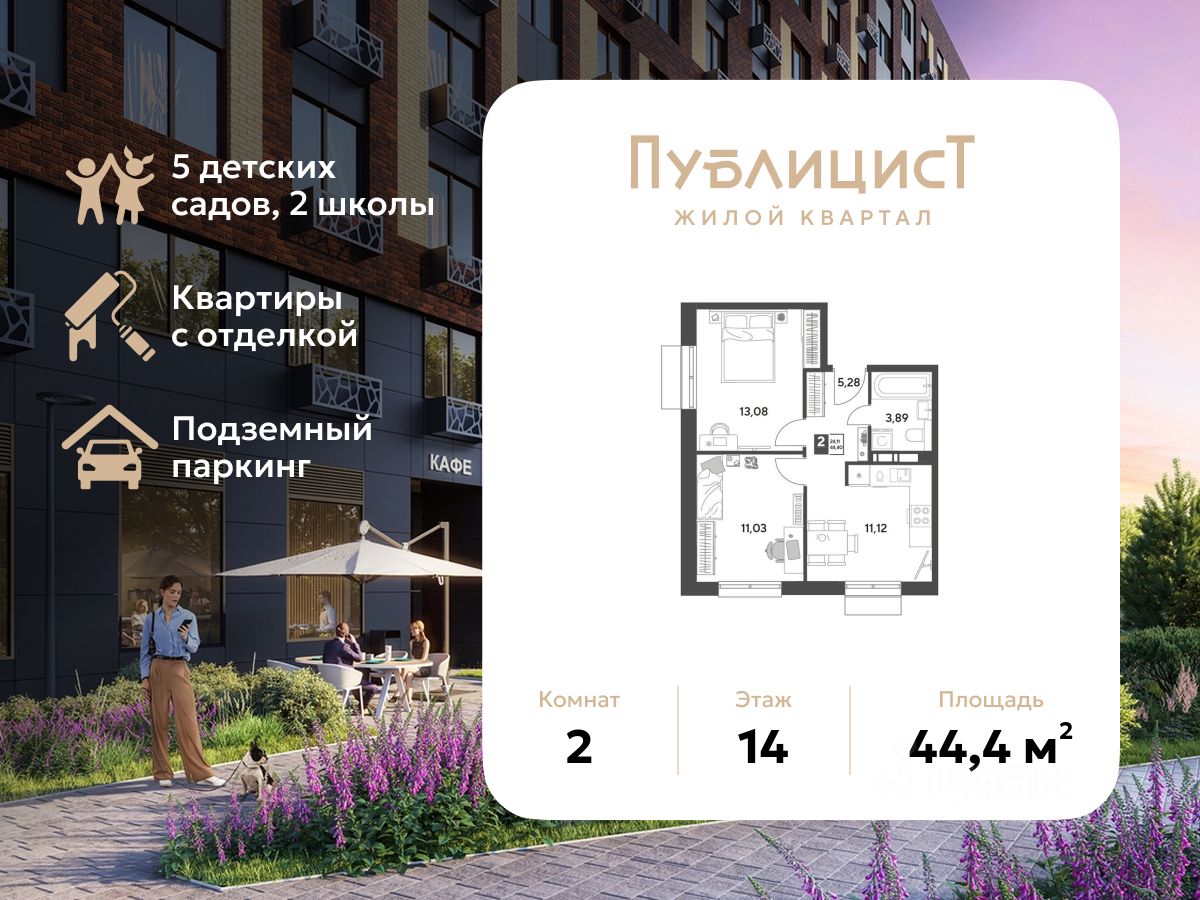 В продаже 2-комнатная квартира площадью 44.40 кв. м на 14 этаже. Квартира расположена в современном жилом комплексе "Публицист" от DOGMA, в корпусе 7.