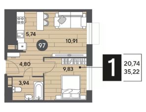 В продаже 1-комнатная квартира площадью 35.22 кв. м на 10 этаже. Квартира расположена в современном жилом комплексе "Публицист" от DOGMA, в корпусе 10.