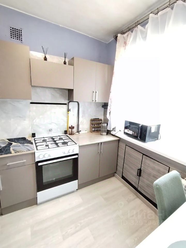 В квартире сделан ремонт. На кухне установлен кухонный гарнитур с бытовой техникой. Напольное покрытие- линолеум, покрытие стен-обои. Установлен фильтр для воды.