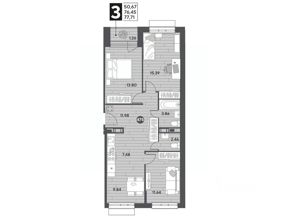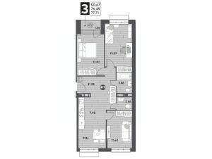 В продаже 3-комнатная квартира площадью 77.71 кв. м на 3 этаже. Квартира расположена в современном жилом комплексе "Публицист" от DOGMA, в корпусе 7.