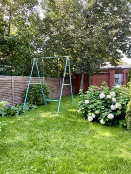 Двор-сад с плодовыми деревьями и кустарниками (яблоки, груши, слива, вишня, смородина, клубника и т.д.) и цветами (розы, тюльпаны и т.д.).