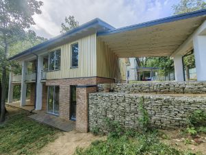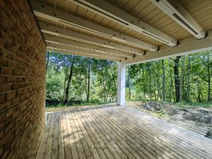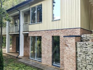 - первый этаж облицован кирпичом ручной формовки, второй этаж деревом;