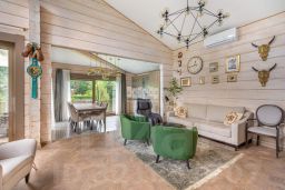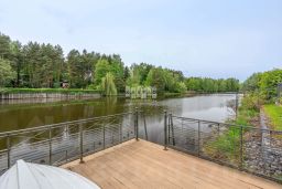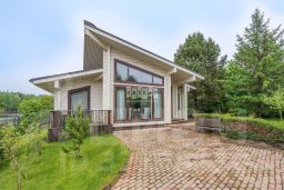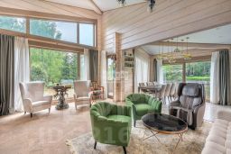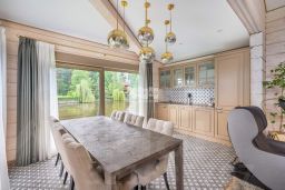 Непосредственно к гостиной примыкает зимний сад, из которого открываются живописные виды на территорию в сторону реки. На участке, вблизи реки, расположен гостевой дом из клееного бруса: с кухней и обеденной зоной, гостиной с камином на дровах, ванной комнатой и кладовой. Идеальное место для отдыха, расслабления и встреч с друзьями.