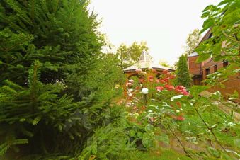 — Хвойные деревья и плодовый сад: яблони, вишни, сливы, смородина.