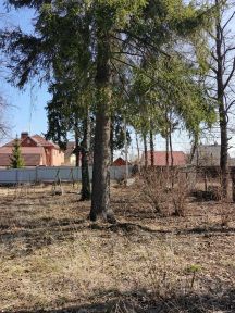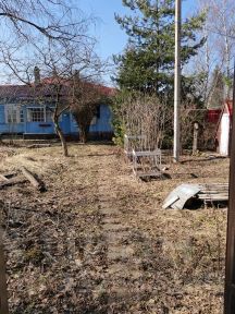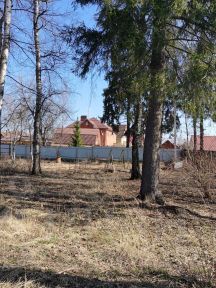 Участок сухой, правильной формы, установлен забор, высажены деревья и кустарники. На участке три яблони, слива и вишня, чёрная смородина, крыжовник, малина, черноплодная рябина, жасмин.