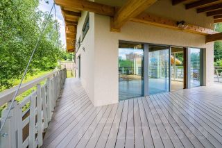 • Большие панорамные окна, создающие единения с природой, крыша с выступающими карнизами и просторные балконы с выходом на большую террасу.