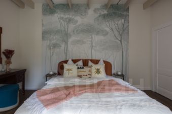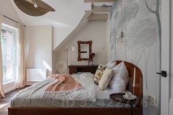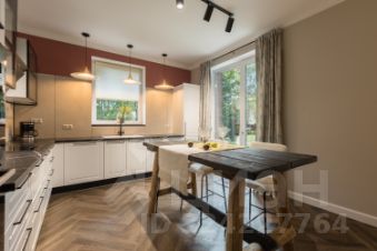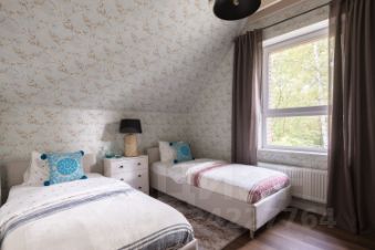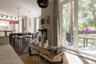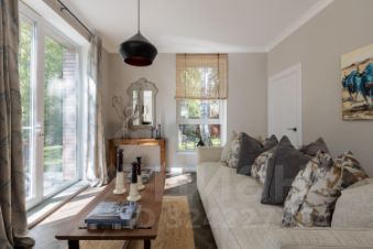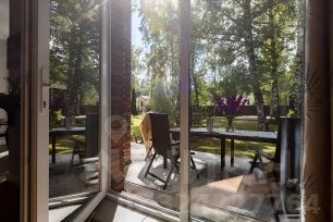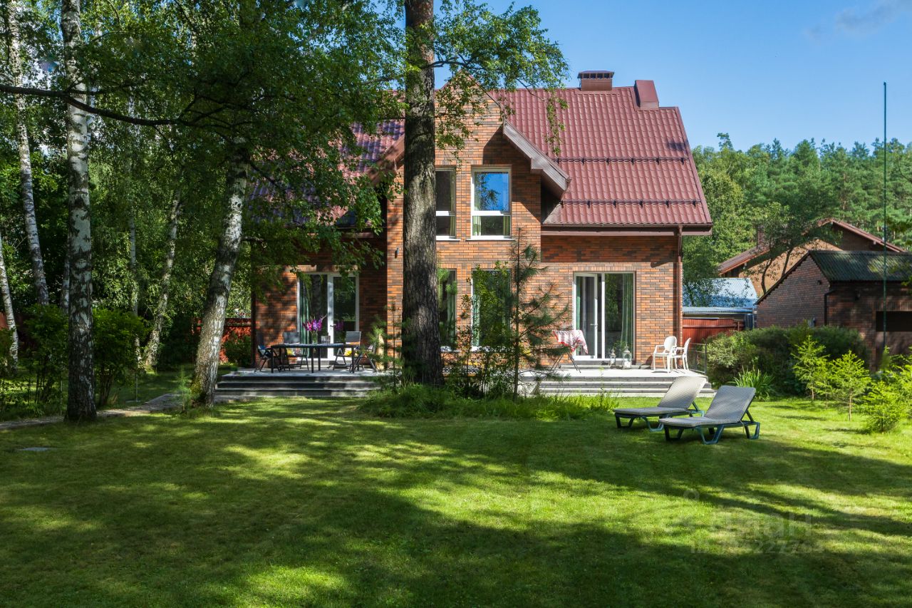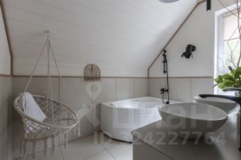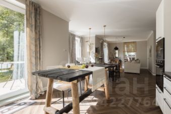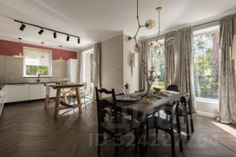 В доме просторная кухня-столовая, гостиная с панорамными окнами, три отдельные спальни, гардеробная комната, кабинет-библиотека , четыре санузла и терраса с видом на участок с вековыми деревьями. Мансардный этаж со спальней и санузлом.