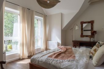 Гардеробная комната и мастер спальня с видом на лес.