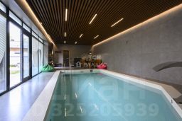Бассейн 7х3,5 метров, весь комплекс выложен высококачественным итальянским керамогранитом, чаша бассейна мозайка, реечный дизайнерский потолок, установлена качественная сплит система автоматической подачи и забора воздуха. Настоящая русская баня, мощная чугунная печь каменка, дизайнерская отделка парной с подсветкой и панно из можжевельника, большая парная рассчитана на 10 человек.