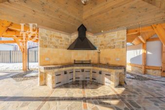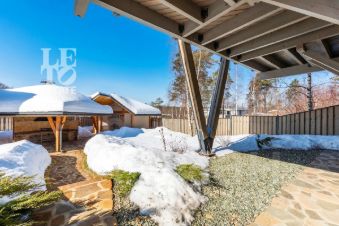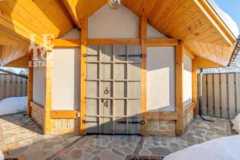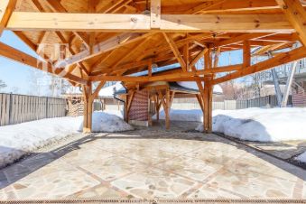 На участке площадью 9 соток выполнен ландшафтный дизайн: дорожки вымощены тротуарной плиткой, высажены декоративные кустарники. Здесь же расположены уютная беседка с подведенной горячей и холодной водой, а также бытовое здание, выдержанное в едином архитектурном стиле с основным домом. Коммуникации включают электричество 15 кВт, магистральный газ, септик и собственную скважину.