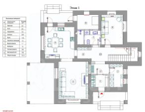 В интерьере были использованы качественные материалы в сочетании разных фактур: керамогранитная плитка, инженерная доска в комнатах, паркет в гостиной. Вся мебель изготавливалась на заказ компанией Галерея мебели, согласно дизайн-проекту. Планировочные решения позволяют максимально эффективно и функционально использовать все пространство дома, все продумано до мелочей. Планировка включает в себя гостиную с камином, кухню-столовую с выходом на участок и четыре светлые спальни.